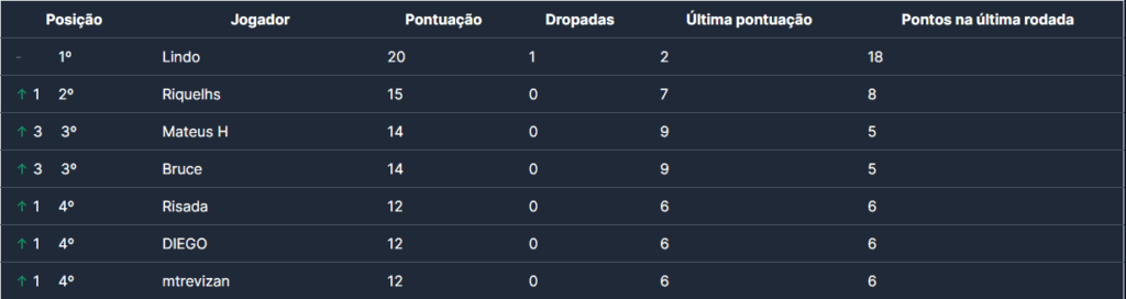 É, essa semana não foi brincadeira, NINGUÉM dropou! Entretanto, tivemos boas pontuações de Mateus H e Bruce, que conseguiram fazer 9 pontos e subiram na classificação, que mostraremos mais abaixo.