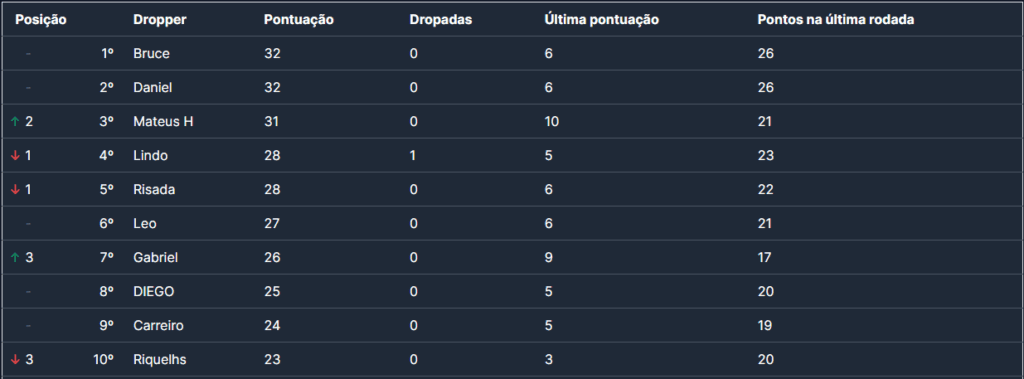 Citamos o destaque da rodada, mas agora vamos listar para vocês quem foi o Top 10 de pontuação dessa rodada 5 do Drop6: