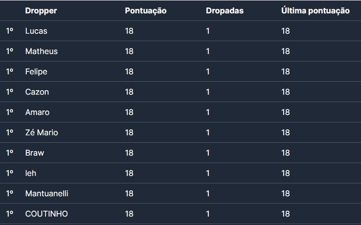 Como dito, logo de cara tivemos QUINZE dropadas na rodada! Veja abaixo o nome dos 15 sortudos da semana, que começaram com o pé direito:
