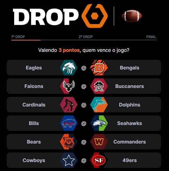 O Drop6 começou com tudo! Os principais jogos do domingo já estão disponíveis para palpitar aqui. Nessa semana, temos um duelo divisional em Falcons x Buccaneers, um equilibrado Eagles x Bengals e uma rivalidade histórica entre Cowboys x 49ers! Por isso, não vai esquecer de palpitar, hein?