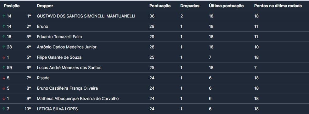 Como dito, logo de cara tivemos TRINTA E DUAS dropadas na rodada! Veja abaixo o nome dos 32 sortudos da semana, que estão na parte alta da classificação do campeonato: