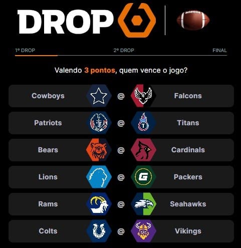 O Drop6 está pegando fogo! Os principais jogos do domingo já estão disponíveis para palpitar aqui. Nessa semana, temos um duelo divisional pegadíssimo em Packers x Lions, um equilibrado Cardinals x Bears e uma rivalidade grande entre Seahawks x Rams! Por isso, não vai esquecer de palpitar, hein?