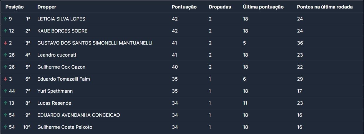 Chegando perto do primeiro terço da competição, já podemos perceber que para lutar pelo título, é preciso Droppar! Com os 5 primeiros tendo gabaritado o Drop 6 duas vezes em três rodadas, temos uma linha de corte de 40 pontos para ficar no top-5, que é liderado por Leticia Lopes e Kaue Borges, com 42 pontos cada. Quem sairá campeão?