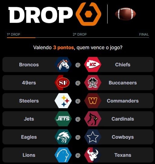 O Drop6 está extremamente acirrado! Os principais jogos do domingo já estão disponíveis para palpitar aqui. Nessa semana, temos um duelo divisional pegadíssimo em Broncos x Cheifs, um equilibrado Steelers x Commanders e um jogaço de times promissores entre Lions x Texans! Por isso, não vai esquecer de palpitar, hein?
