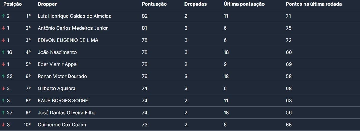 Faltando três rodadas para o término do Drop 6, esses são os 10 primeiros colocados, que mostram a cada semana que estão sedentos pelo título! Mesmo tendo só duas dropadas em sete semanas, Luiz Henrique mostra uma consistência fora de série e assume a liderança do Drop 6 com 82 pontos, seguido de perto pelo antigo líder Antônio Carlos com 81 e com Edivon (78), João Nascimento (78) e Eder (78) completando o top-5. Quem vai se sagrar como o grande campeão?