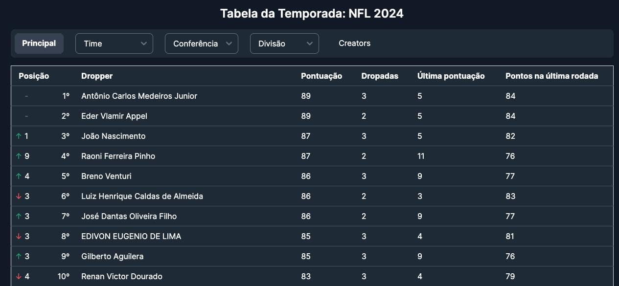 Bem amigos da rede FNN, a rodada 9 está nos livros! Teve gente perdendo a Droppada porque o RB soltou a bola antes de fazer o TD, um jogaço de 90 pontos, jogos que tiveram impactos nos playoffs e dezessete droppers gabaritando os 6 jogos, o que impactou na classificação do campeonato. Por isso, que tal fazermos um breve review sobre tudo que aconteceu na semana 8 do Drop 6 da NFL 2024?