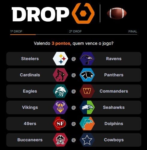 Os principais jogos do domingo já estão disponíveis para palpitar aqui. Nesta semana, temos uma das maiores rivalidades da liga em Steelers x Ravens, um disputadíssimo Vikings x Seahawks e um equilibrado duelo divisional entre Commanders x Eagles! Por isso, não vai esquecer de palpitar, hein?