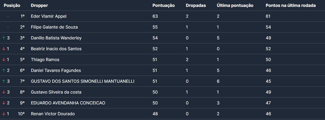 Com o fim do período de Drop 6 da NHL em 2025, aí está a classificação final com os 10 primeiros colocados. Apesar do top-10 se manter inalterado, tivemos mudanças muito importantes no topo. O líder Eder Appel conseguiu manter a ponta e se tornou bicampeão do Drop 6, já que havia vencido o da NFL em 2024 (isso que é ter estrela, hein?). Filipe Galante foi vice com 55 pontos, Danillo Batista em terceiro com 54 e Beatriz em quarto com 52. Fechando o top-10, ficaram em ordem: Thiago Ramos (51), Daniel Tavares (51), Gustavo Mantuanelli (51), Gustavo Silveira (50), Eduardo Conceição (50) e Renan Dourado (48).
