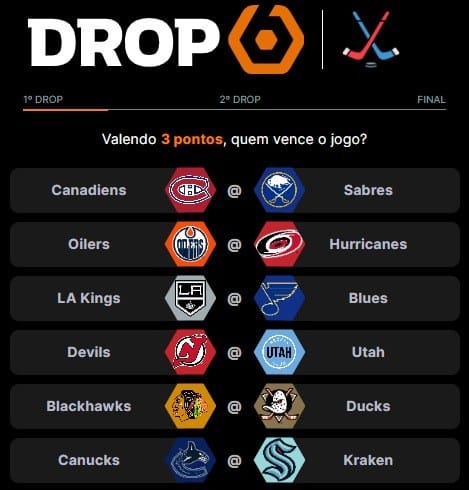 O Drop6 segue pegando fogo! Os principais jogos do sábado já estão disponíveis para palpitar aqui. Nesta semana temos um jogo de altas implicações de playoffs em Kings x Blues, um equilibrado Oilers x Hurricanes e um Devils x Utah de tirar o fôlego! Por isso, não vai esquecer de palpitar, hein?