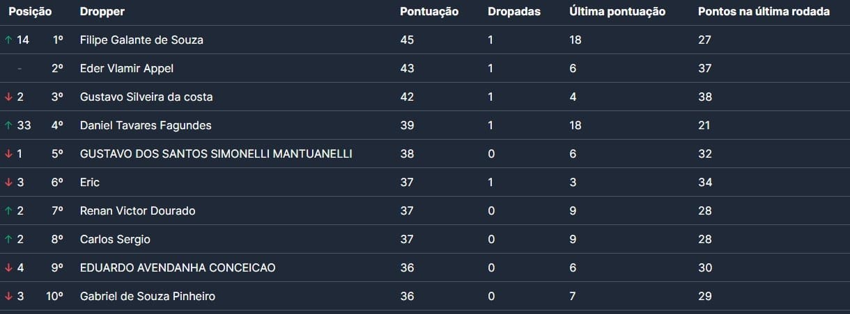 Como dito, tivemos três dropadas na rodada! Veja abaixo o nome dos sortudos da semana, que estão subiram muito na classificação do campeonato:
