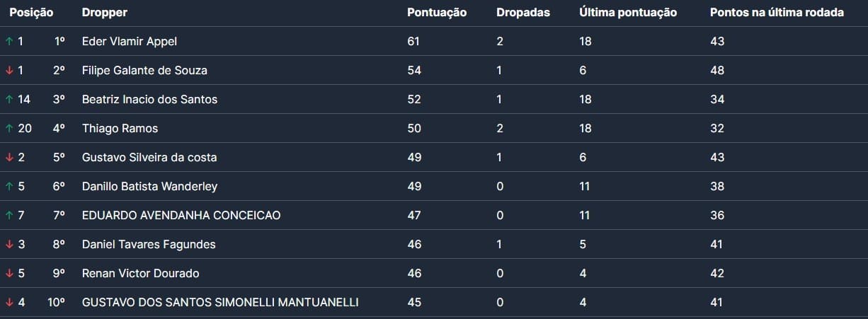 Como dito, tivemos três dropadas na rodada! Veja abaixo o nome dos sortudos da semana, que estão subiram muito na classificação do campeonato: