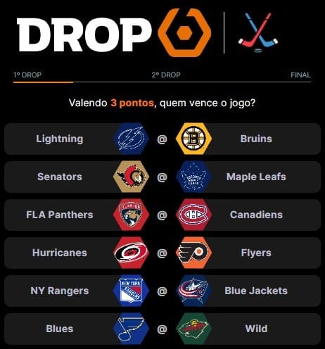 O Drop6 da NHL 2025 caminha para a sua semana final! Os principais jogos do sábado já estão disponíveis para palpitar aqui. Nesta semana temos um jogo de altas implicações de playoffs em Blues x Wild, um clássico entre Senators x Maple Leafs e um Rangers x Blue Jackets de tirar o fôlego! Por isso, não vai esquecer de palpitar, hein?