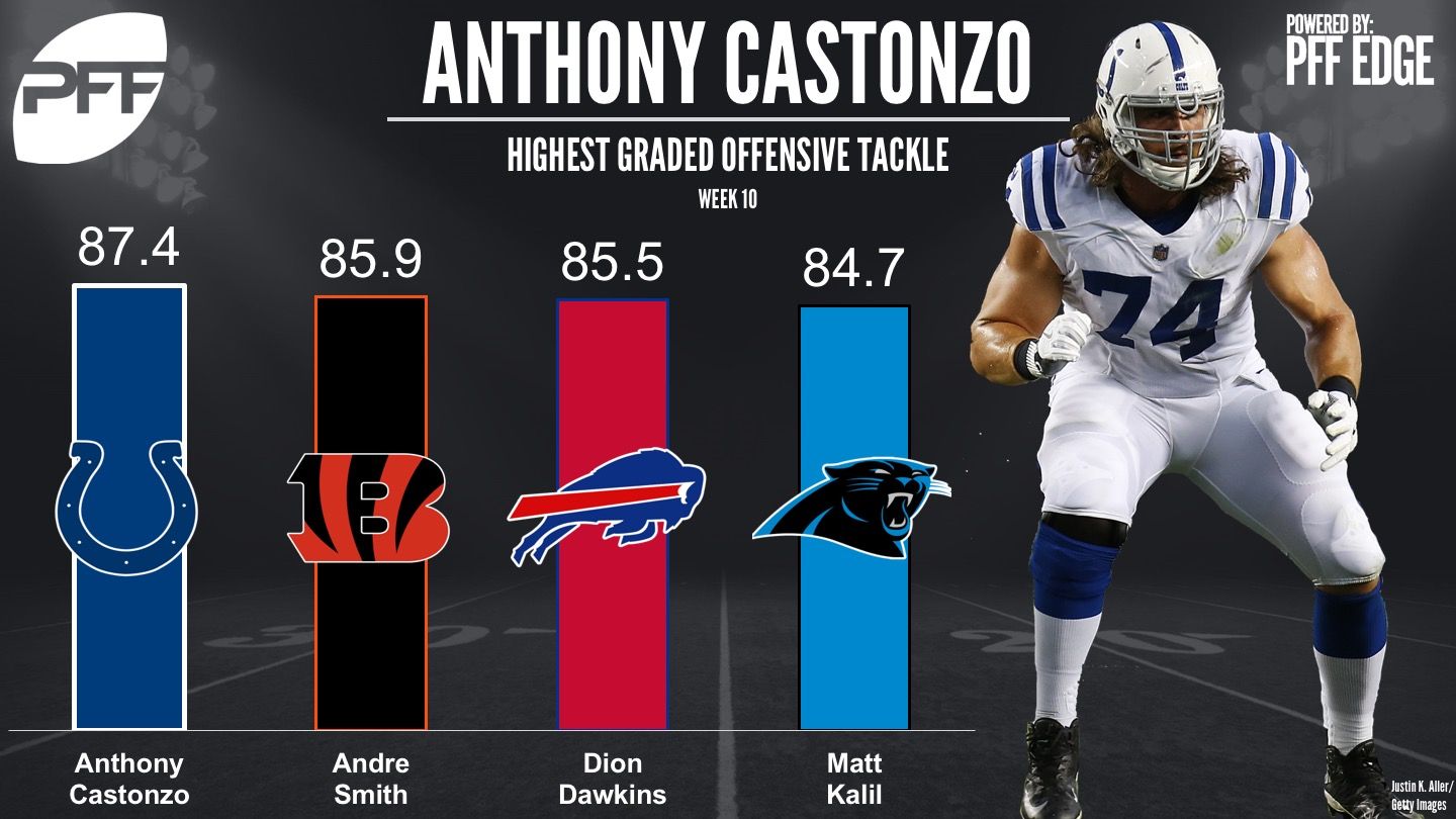 Na linha ofensiva um jogador merece destaque: Anthony Castonzo. O left tackle que há algum tempo vinha sendo questionado tem feito uma temporada impecável. Todo seu trabalho foi mostrado no jogo da semana 10. Melhor jogador da semana em sua posição, Castonzo não permitiu que Brissett fosse pressionado pelo lado esquerdo do ataque. Sem faltas em um jogo contra a forte defesa do Steelers, Castonzo foi, junto a Rogers, um dos melhores jogadores do ataque do Colts.