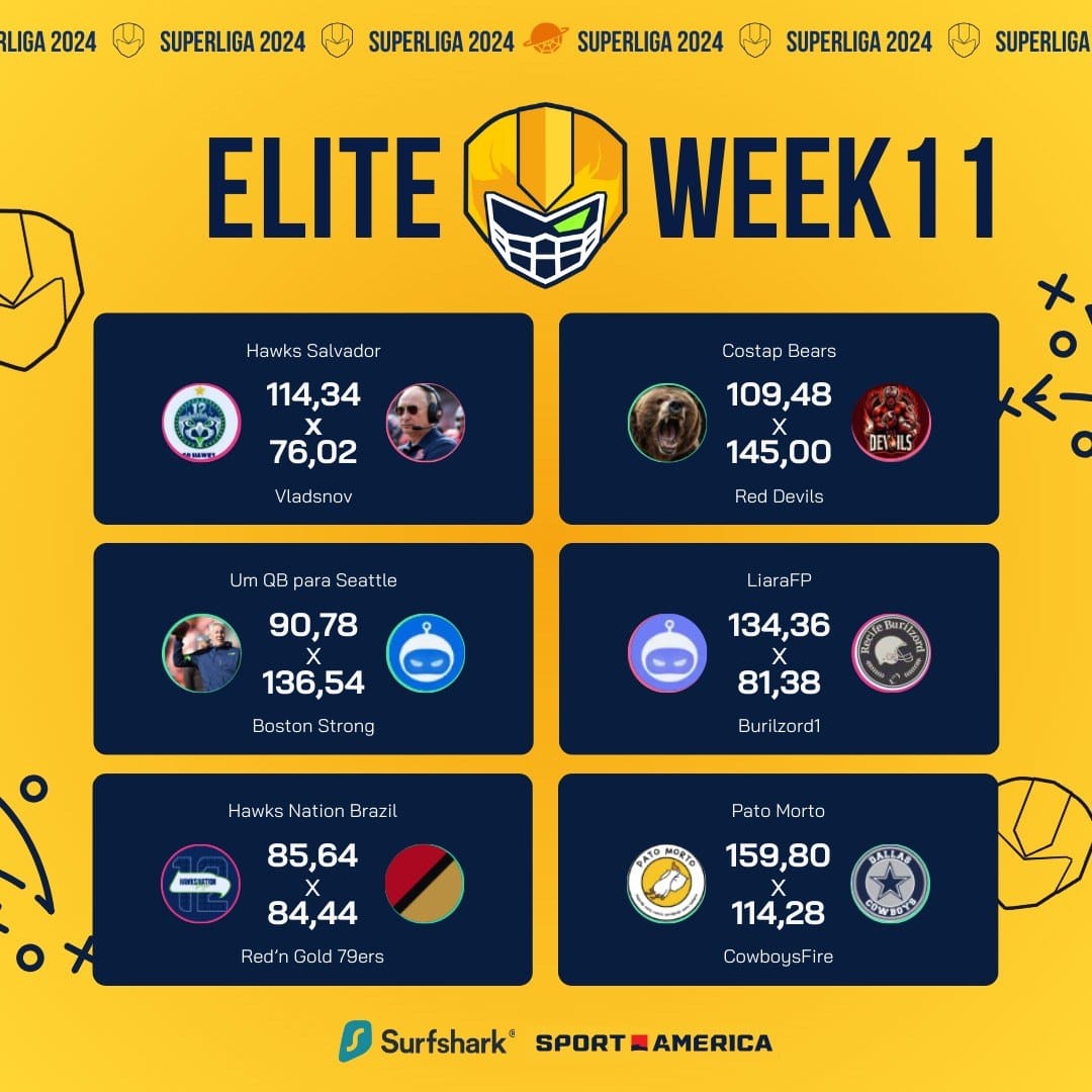 Na Liga de Elite, o grande destaque da semana foi a vitória do líder Pato Morto sobre o vice-líder CowboysFire por 45 pontos, abrindo dois jogos de vantagem na liderança. Além disso, sete times estão brigando pelas últimas vagas nos playoffs. Vale destacar que quem acabar no topo dessa liga, ganhará o anel de campeão brasileiro de fantasy 2024!