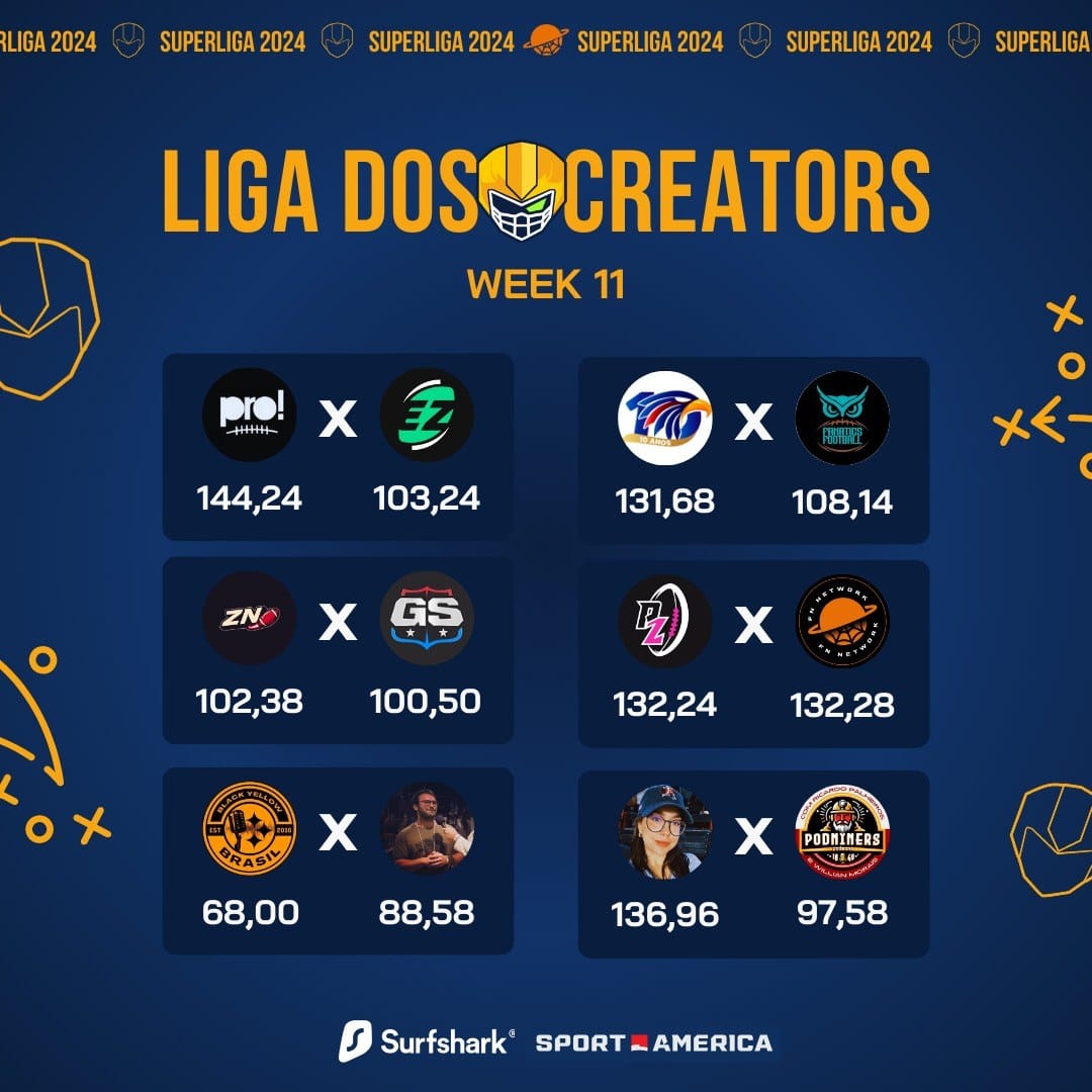 Os destaques da semana entre os creators foi a vitória de lavada do ProFootball sobre o Endzone Brasil, o mantendo muito vivo pela briga por folga na primeira rodada dos playoffs, as vitória apertadas do líder Zona Neutra sobre o embalado Golim e da FNN sobre o Pinkzone, e a belíssima atuação da Pathy dos Reis sobre o PodNiners, se mantendo na vice-liderança.
