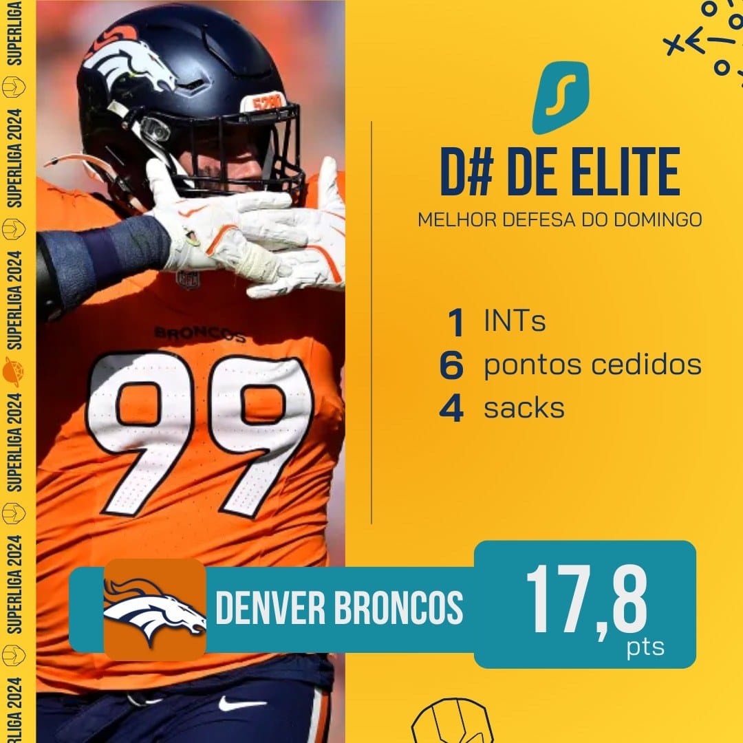 O destaque defensivo da semana foi o Denver Broncos! A unidade cedeu somente 6 pontos, forçou 1 interceptação e 4 sacks para ajudar no massacre da equipe sobre o Atlanta Falcons, em casa!
