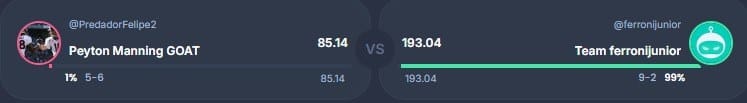 Diretamente da Liga 32, o Ferronijunior (8-2) conseguiu uma vitória avassaladora em duelo contra o Peyton Manning GOAT (5-5), o mantendo vivo na briga para conseguir a seed 1. Sendo simplesmente perfeito na escolha da lineup, fez a maior pontuação da semana da Superliga, vencendo por uma margem de 108 pontos! Confira abaixo o time do líder da décima primeira semana do maior fantasy do Brasil: