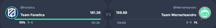 Mesmo fazendo 156.68 pontos (maior marca de um perdedor em 2024!!!), o suficiente para ganhar de mais de 95% dos desafiantes da Superliga, o Wernerleandro (5-5) acabou enfrentando o Fanatica (4-6), em um confronto entre times que brigam pela última vaga dos playoffs da liga 50, e perdeu! Apesar de ter Jared Goff (34.58), Cooper Kupp (25.60), Chris Boswell (23.00) e a defesa do Vikings (17.00), o desafiante foi superado por um time que contou com Breece Hall (27.60), Puka Nacua (21.80), Tee Higgins (25.30) e a defesa do Texans (25.00). Foi no detalhe!