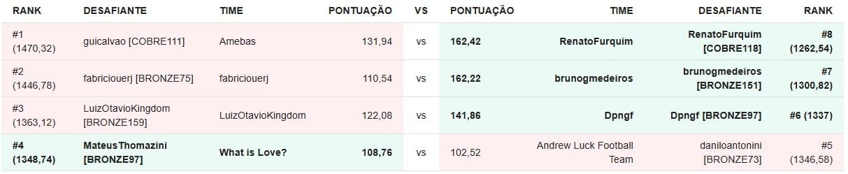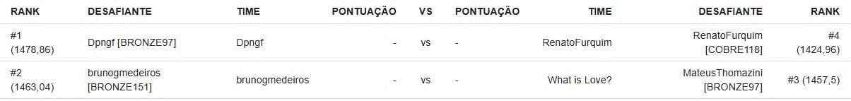 Para a semana 13, somente as duas vagas serão disputadas pelos desafiantes restantes e os confrontos já estão definidos: Dpngf (#1) enfrenta o RenatoFurquim (#4), enquanto o Brunogmedeiros (#2) enfrenta o What is Love? (#3). Quais são suas apostas?
