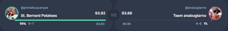 Em um duelo importantíssimo para ambos na liga 146, valendo a sobrevivência na temporada, o St. Bernard Potatoes (4-7) acabou vencendo a Anabugtarno (4-7) por 0.04 pontos, ou seja, uma jarda! A diferença antes de começar o MNF era de pouco mais de 6 pontos para a Ana, que só precisava que Jauan Jennings, WR dos 49ers, não pontuasse mais do que seis pontos que Chuba Hubbard, RB dos Panthers. Mas foi isso que aconteceu! Em um jogo morno de ambos os ataques, Hubbard conseguiu somente 43 jardas de scrimmage, enquanto Jennings teve 57, mas com um TD salvador que garantiu a vitória do St. Bernard, que assume a oitava colocação, estando somente um jogo atrás da zona de playoffs. Loucura!