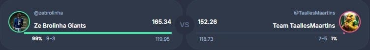 Mesmo fazendo 152.26 pontos, o suficiente para ganhar de mais de 95% dos desafiantes da Superliga, o TaallesMaartins (7-4) acabou perdendo a possibilidade de se classificar aos playoffs ao perder para o líder Ze Brolinha Giants (8-3), mantendo a disputa pelas últimas vagas de playoffs da liga 50 em aberto! Apesar de ter Dak Prescott (27.56), Ashton Jeanty (20.80), Amon-Ra St. Brown (25.40) e Jaxon Smith-Njigba (33.10), o desafiante foi superado por um time que contou com Christian McCaffrey (23.70), George Pickens (25.10), Wan’Dale Robinson (26.10) e a defesa do Los Angeles Rams (22.30). Tudo aberto para as semanas finais!