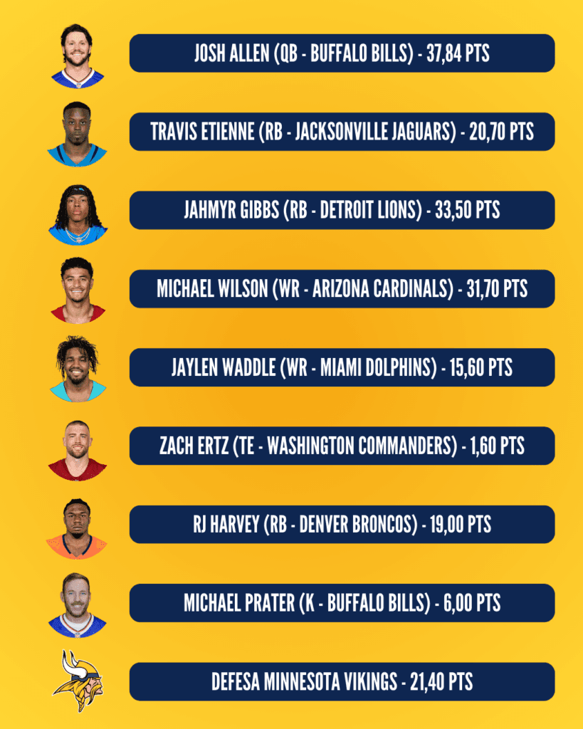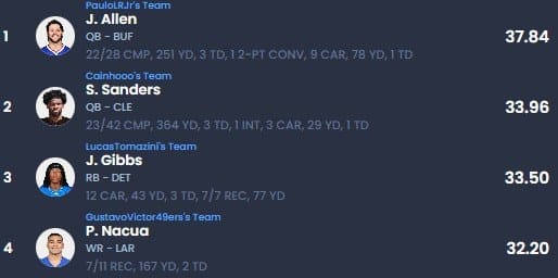 Os grandes destaques do confronto foram Josh Allen (37.84) e Jahmyr Gibbs (33.50) que, juntos, conseguiram abrir larga vantagem no confronto para encaminhar o primeiro título da história da Superliga Cup ao Dpngf, garantindo um kit campeão completo e sem custo (camisa oficial da Superliga + superplaca)! Para revisar todas as fases desta competição, basta clicar aqui.