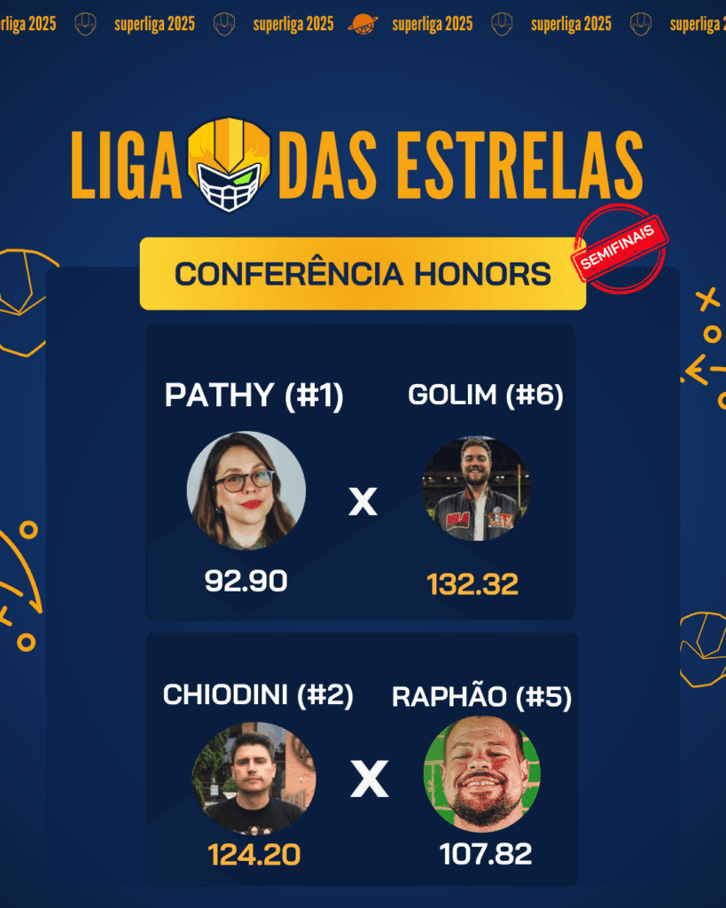 Já na conferência dos Honors, tivemos mais um upset do Golim! Desta vez, vitória por quase 40 pontos de vantagem sobre a seed 1 Pathy dos Reis. Na outra semifinal, o atual campeão, Deivis Chiodini, segue vivo em busca do bicampeonato após derrotar o Raphão Martins por 17 pontos. Assim, a final da conferência dos Honors será entre Golim e Deivis Chiodini. Vale destacar que os campeões de suas conferências jogam a grande final da Liga das Estrelas na semana 17!