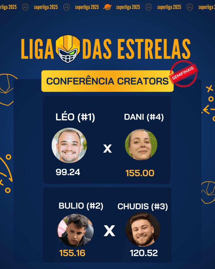 A semana de divisional round teve de tudo na Liga das Estrelas! Pela conferência dos Creators, a Dani massacrou o seed 1 Léo uma vitória de mais de 55 pontos de vantagem! Além disso, o Bulio derrotou o Gabriel Chudis por 35 pontos, fazendo com que a grande final da conferência seja entre o seed 2 Bulio e a seed 4 Dani!
