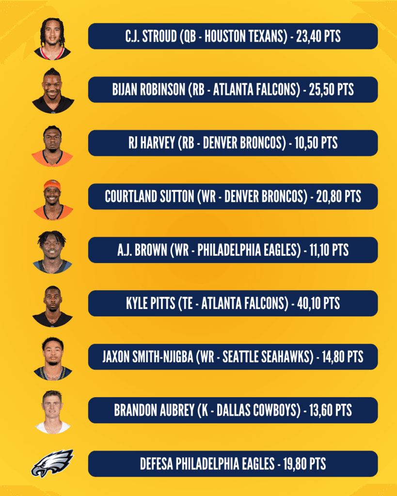 Vale ainda mencionar que a diferença antes de começar o Monday Night Football era de exatos 3,80 pontos para o Ruan, que precisava que Jaylen Waddle não superasse essa diferença. E foi isso que aconteceu! Em um jogo com temperatura negativa em Pittsburgh, Miami não conseguiu lançar a bola de forma efetiva e Waddle terminou a partida com apenas duas recepções para 26 jardas, totalizando 3,60 pontos no fantasy. Vitória suada e classificação garantida! Será que é sorte de campeão?