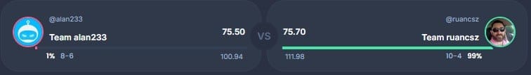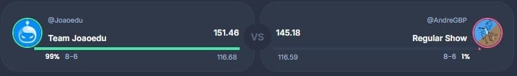 Pela primeira vez, um único confronto de playoffs aparece em duas categorias distintas no recap da semana. O Ruancsz (10-4) acabou vencendo o Alan233 (8-6) por 0.20 pontos, ou seja, por DUAS jardas, conquistando uma importante vaga na semifinal da liga 101! Além disso, foi o vencedor com a menor pontuação da semana, com apenas 75.70 pontos marcados (seria derrotado em praticamente TODOS os confrontos da semana), com o grande destaque indo para Kyren Williams, que contribuiu com quase 29% dos pontos do vencedor.