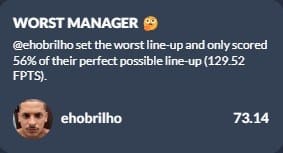 Nessa semana 2, o Ehobrilho não brilhou. Em duelo de times 0-1, acabou perdendo por 25 pontos pois enquanto o time titular tinha Matthew Stafford, Xavier Worthy, Sam LaPorta e Justice Hill, que fizeram 16,34 pontos somados, no banco ficaram Joe Burrow (17,22 pontos), D.K. Metcalf (23,90), Darnell Mooney (16,30), e Romeo Doubs (7,70).