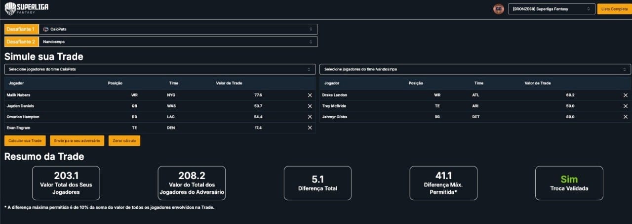 Os Desafiantes da Superliga 2025 já estão realizando suas simulações de trades na Calculadora de Trades da Superliga. Se você ainda não conhece, utilize a calculadora para simular e enviar trades para seus oponentes e melhorar o seu time durante a temporada!