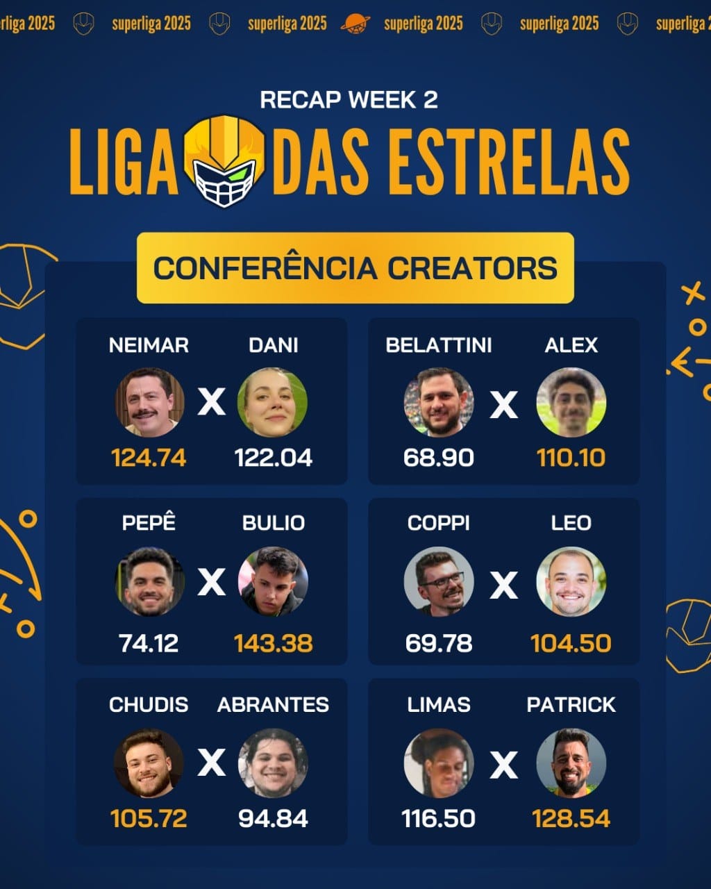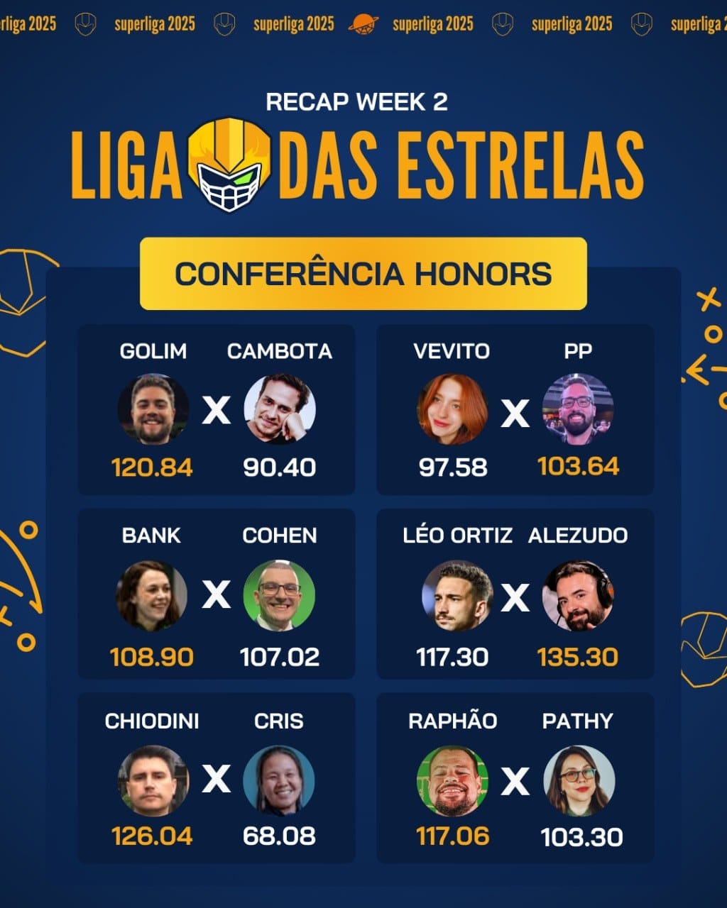 Por fim, na Liga de Elite, vitórias importantes do Pato Morto, Big Ben’s (sobre o atual campeão Jadsom, por apenas 1 ponto) e do Marcos96 que os colocam como únicos invictos de 2025 da liga, liderando a disputa pelo anel de campeão brasileiro de fantasy 2025!