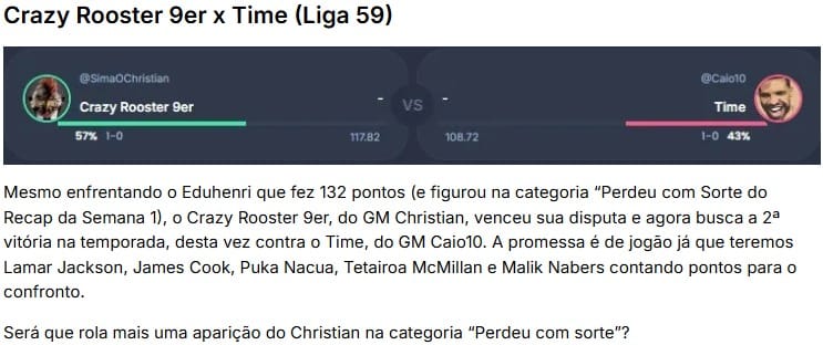 Um dia é da caça, outro do caçador. Na semana 1, o Crazy Rooster 9er venceu o Eduhenri, mesmo com o adversário fazendo 132.96 (maior pontuador derrotado). Nesta semana, mesmo fazendo 138.20, o suficiente pra ganhar de boa parte dos desafiantes da Superliga, o GM Christian não conseguiu protagonizar a virada no seu confronto nos MNFs, já que Emeka Egbuka (10.90) e Daniel Carlson (12.00) precisavam fazer ao menos 24.89 somados para vencer o confronto. Vale destacar que este confronto estava no top 10 da semana e rolou uma previsão absurda deste que vos escreve (vejam na foto abaixo). Quem não viu o texto completo, pode conferir aqui.