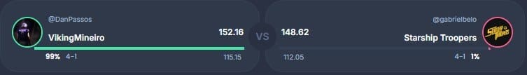 Mesmo fazendo 148.62 pontos, o suficiente pra ganhar de boa parte dos desafiantes da Superliga, o Starship Troopers acabou perdendo não só sua invencibilidade, como também a chance de assumir a liderança isolada da liga 129 ao perder para o forte time do VikingMineiro, que contou com os inspirados Baker Mayfield, Jonathan Taylor, Kyren Williams, Deebo Samuel, Travis Kelce e Breece Hall para fazer mais de 152 pontos na semana. Com isso, são três times 4-1 na liga, deixando a disputa completamente embolada!