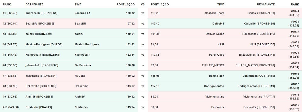 São eles: BearsBR (#2) contra o Caibal46 (#1023), NVColts (#7) contra o DakInBlack (#1018) e o DeFrazilho (#8) contra o RodrigoFontao (#1017).