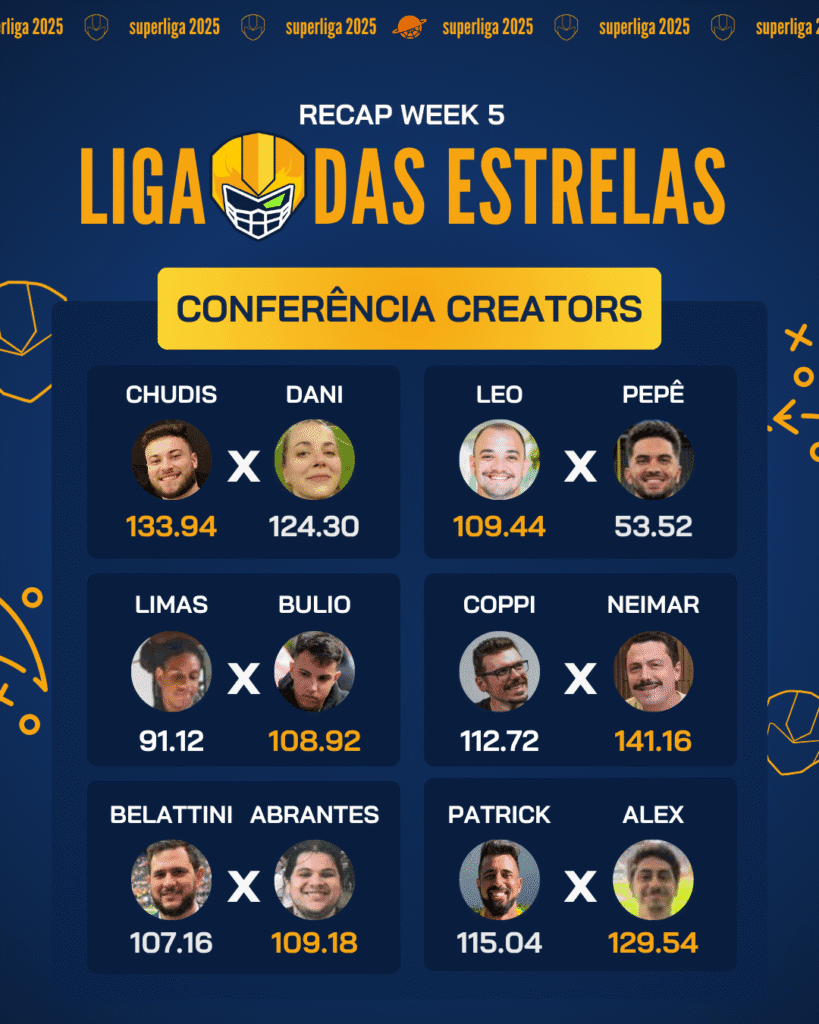 Os destaques da semana entre os creators foram a manutenção da disputa pela liderança entre Gabriel Chudis e Bulio, o equilibradíssimo duelo entre Belattini e Abrantes e a vitória do Neimar contra o Coppi no confronto do Zona Neutra.