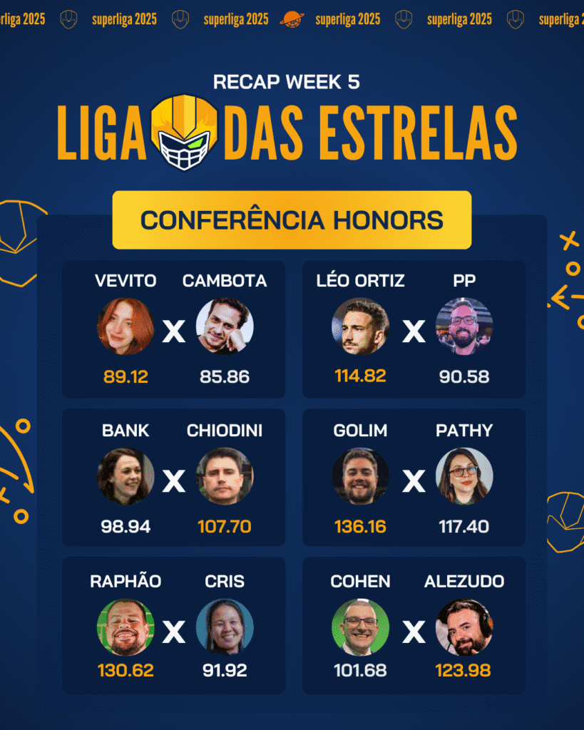 Na Liga de Elite, o Marcos derrotou o Big Ben’s no primeiro duelo de invictos da temporada, igualando o recorde do Pato Morto de 5-0. Além disso, Dr.Jhon e Rangones venceram seus primeiros jogos no ano e buscam se recuperar na liga que vale o anel de campeão brasileiro de fantasy 2025!