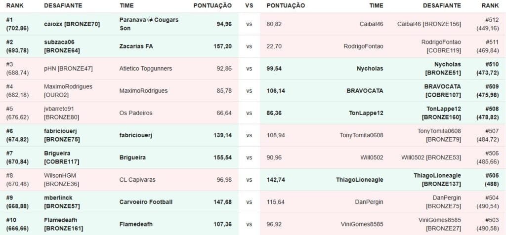 São eles: Atlético Topgunners (#3) contra o Nycholas (#510), MáximoRodrigues (#4) contra o Bravocata (#509), Os Padeiros (#5) contra o TonLappe12 (#508) e o CL Capivaras (#8) contra o ThiagoLioneagle (#505).