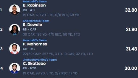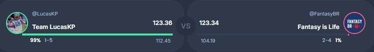 Novamente, somente UMA jarda foi a diferença de uma partida da Superliga. O LucasKP conquistou sua primeira vitória na temporada ao derrotar o Fantasy is Life por uma margem de vitória de apenas 0.02 pontos, com a vitória acontecendo no MNF maluco entre Washington Commanders x Chicago Bears. Em vantagem de 15,66 pontos, o Lucas precisava que Jayden Daniels não superasse essa diferença contra o Matt Gay, kicker dos Commanders. E foi exatamente isso que aconteceu! Mesmo fazendo uma boa pontuação de 22.14 pontos, o fumble sofrido pelo QB na reta final da partida foi determinante para a primeira vitória do Lucas na liga 78. Será que vem recuperação histórica por aí?