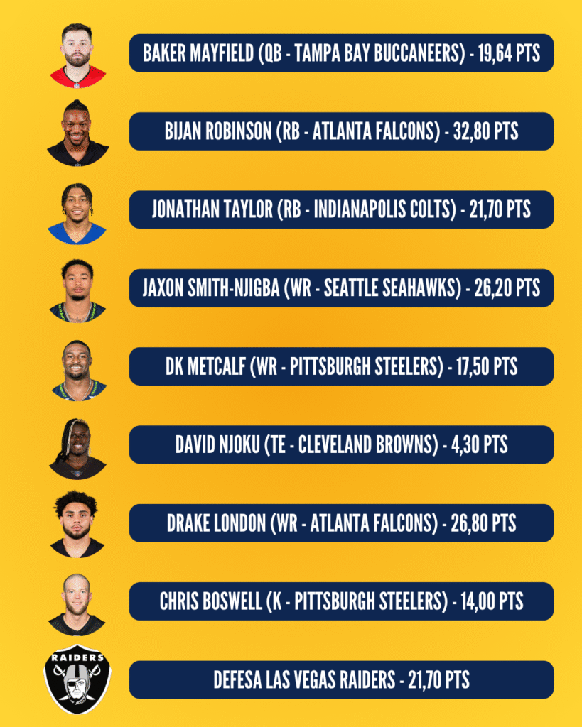 Diretamente da Liga 153, o RunRunPassPunt, do GM Fábio, conseguiu fazer a maior pontuação da semana 6 e a maior da Superliga 2025 (!) em um duelo de equipes da zona de corte de playoffs. O Fábio 3-2 venceu o 2-3 CFC Chargers com uma vantagem final de quase 76 pontos! Confira abaixo o time do líder da sexta semana do maior fantasy do Brasil: