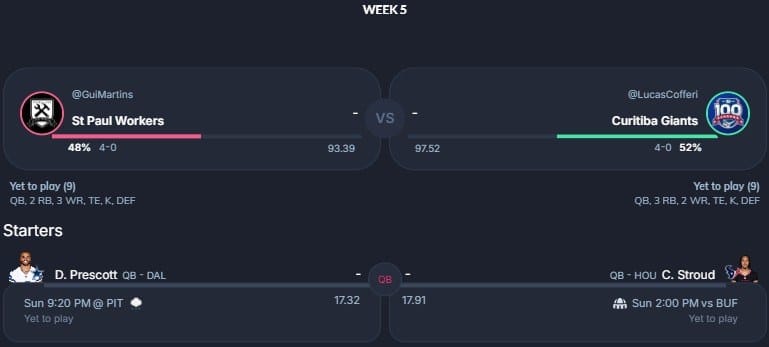 Duelo direto entre o líder, Curitiba Giants, e o vice-líder, St Paul Workers. O time do Lucas Cofferi é o maior pontuador da liga, com mais de 500 pontos marcados, e conta com Derrick Henry, Terry McLaurin e Alvin Kamara para manter a média de 126,5 pontos por jogo.