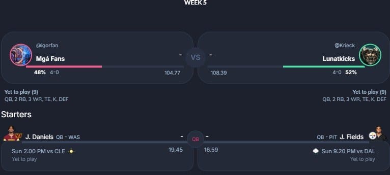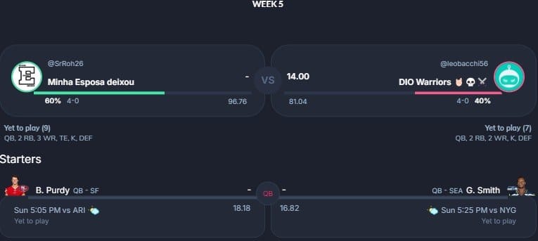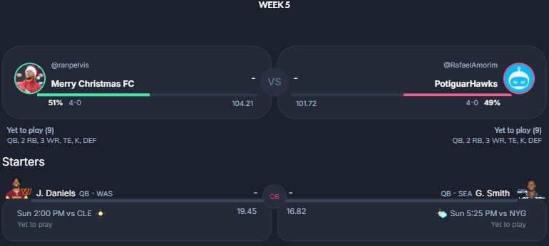 Com os confrontos entre desafiantes invictos cada vez mais escassos, tendo somente quatro nessa semana 5, temos o mais parelho da nossa lista na liga 63. Apenas 3.51 pontos projetados separam o Merry Christmas FC do PotiguarHawks. De um lado, Jayden Daniels e Kyren Williams. Do outro, Deebo Samuel e CeeDee Lamb. Quem será que vence o confronto que vale a liderança da liga?