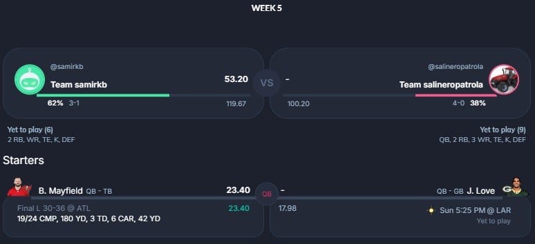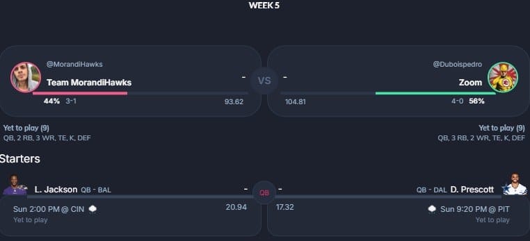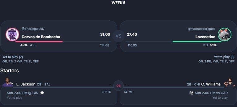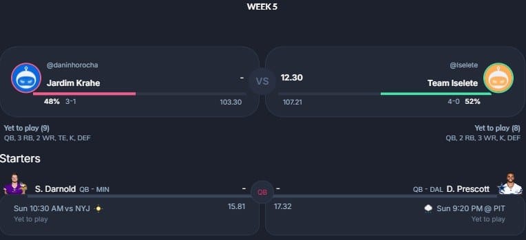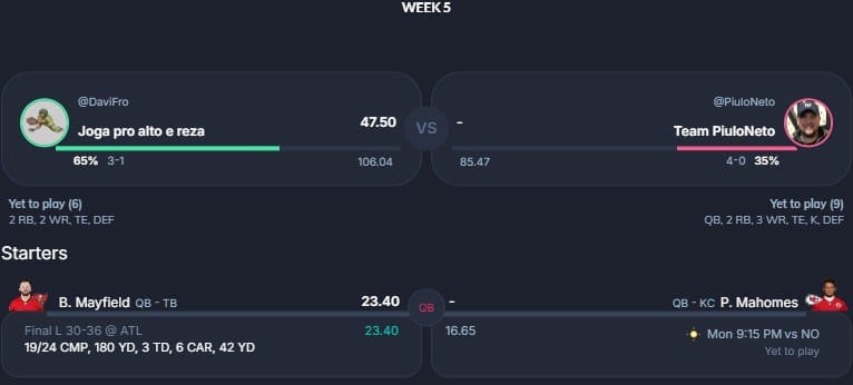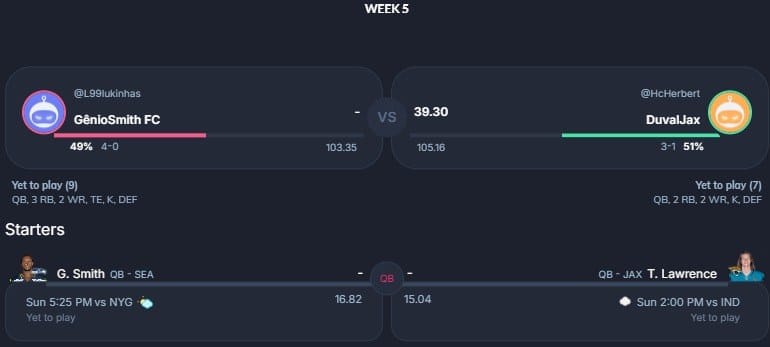 Pela primeira vez nessa temporada, o 5° confronto da nossa lista não figura dois invictos. Entretanto, emoção é o que não vai faltar entre GênioSmith FC e DuvalJax. Com 27 pontos de Darnell Mooney e 12.30 de Kyle Pitts, o DuvalJax abriu boa vantagem no confronto. Seu adversário, Lucas, confia em Kyren Williams, Kenneth Walker e CeeDee Lamb para virar o confronto e manter a liderança da liga 69.