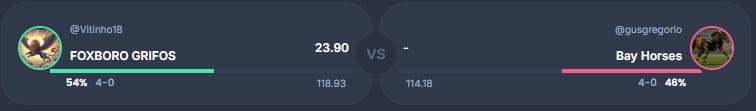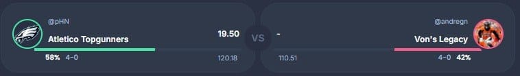 Na liga 47, temos um confronto muito imprevisível. O Atlético Topgunners contou com uma ótima partida de Puka Nacua (19.50) para abrir vantagem no seu confronto. Entretanto, seu QB titular, Lamar Jackson, está fora do jogo de domingo, impactando na projeção de pontos. Ele terá que confiar no seu substituto, Dak Prescott, para vencer o Von’s Legacy, que conta com Jalen Hurts, Amon-Ra St. Brown e Chris Olave na sua lineup.