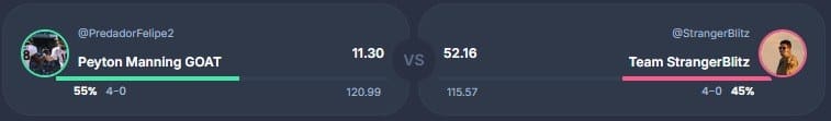 Duelo direto entre o líder, Peyton Manning GOAT, e o vice-líder, StrangerBlitz. O time do Felipe é o maior pontuador da liga, com mais de 500 pontos marcados, e conta com De’Von Achane, Amon-Ra St. Brown e Trey McBride para manter a média de 130 pontos por jogo.