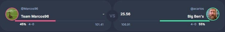 Com os confrontos entre desafiantes invictos cada vez mais escassos, tendo somente sete nessa semana 5, temos o mais importante deles acontecendo simplesmente na Liga de Elite. Após uma ótima partida de Matthew Stafford (25.56 pontos), o Big Ben’s abriu uma boa vantagem no confronto que vale a liderança compartilhada da liga mais importante da Superliga de Fantasy (caso o Pato Morto, também 4-0, vença seu confronto), contando ainda com Jahmyr Gibbs e Tyler Warren na lineup. Entretanto, o Marcos possui uma forte equipe com jogadores como Patrick Mahomes, JK Dobbins e Jaxon Smith-Njigba. Quem vence o duelo na liga que vale o anel de campeão brasileiro de fantasy?