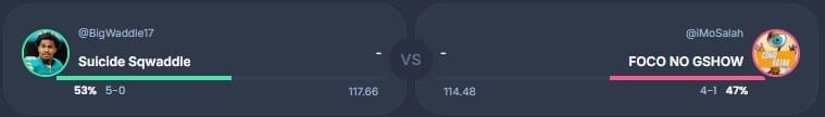 Duelo direto entre o líder, KathFurys, e o vice-líder, Guilherme92. O Guilherme saiu na frente com ótima vantagem de 42.62 pontos somados entre Jalen Hurts (21.12) e Dallas Goedert (21.50), mas não poderá contar com Chris Godwin esta semana, por lesão. Porém, o time ainda conta com Christian McCaffrey e Zay Flowers para assumir o topo da liga.