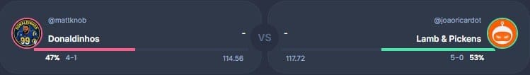 Emoção é o que não vai faltar entre Donaldinhos e Lamb & Pickens, já que o Sleeper projeta como o confronto mais parelho do nosso top 10: 3.16 pontos de diferença! O líder (e um dos dois últimos invictos) da liga conta com Patrick Mahomes, Achane e Quinshon Judkins como grandes trunfos. Seu adversário, fã do lendário Aaron Donald, confia em Baker Mayfield, Ashton Jeanty e Drake London para brigar pela liderança da liga 12.