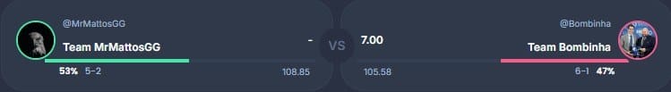 MrMattosGG x Bombinha marca um grande duelo entre dois dos melhores ataques da liga 72. O time do Mattosi já tem mais de 798 pontos marcados, e conta com Saquon Barkley, Brock Bowers e DK Metcalf para manter a média de 114 pontos por jogo.